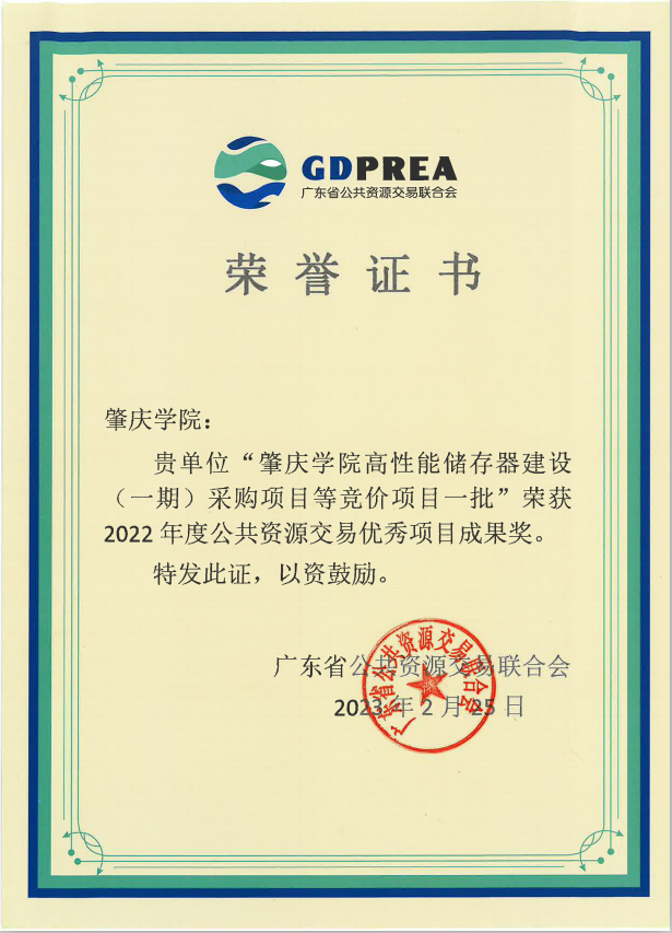 据悉,本次活动共评选出“广东省 2022 年度公共资源交易改革创新优秀成果奖”8 个,“广东省 2022 年度公共资源交易优秀项目成果奖”56 个。我校申报教育设备更新改造项目“万象城娱乐awc线路高性能储存器建设(一期)采购项目等竞价项目一批”荣获2022年度公共资源交易优秀项目成果奖。