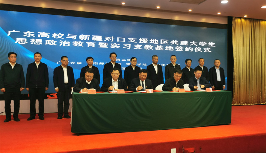 本网讯 3月26日,广东高校与新疆对口支援地区共建大学生思想政治教育暨实习支教基地(以下简称“校地共建”)签约仪式在新疆喀什举行。粤新两地领导出席签约仪式。我校党委副书记谢冠华,党委委员、组织部部长欧洪湛,教育科学学院党委副书记刘远君等参加活动。
