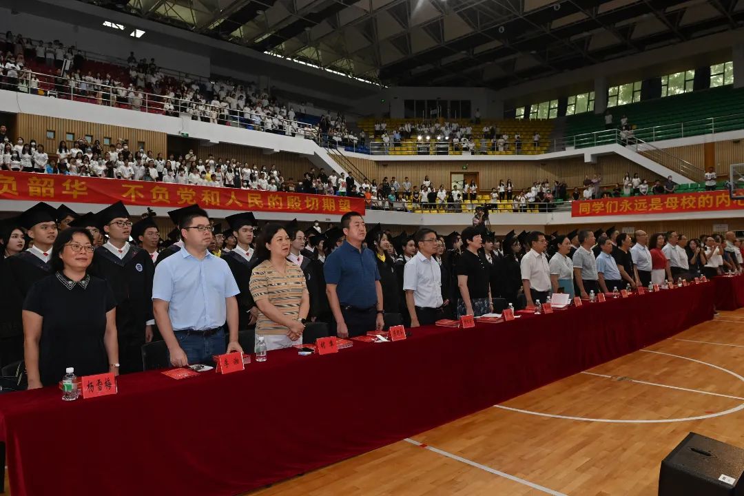 校党委书记曾桓松,校长吴业春、副校长肖起清、李新昌、唐冬冬,广东工业大学帮扶工作队队长刘怡军,校党委委员欧洪湛、谭冠中、陈前出席并在主席台就坐。相关职能部门领导,各二级学院书记和院长、辅导员,2019级毕业生代表及校友代表参加典礼。以及来自祖国各地的毕业生家长及校友代表们。其他师生通过学校官方微信视频号的直播一起相聚云端,共同见证这一难忘时刻。校党委副书记谢冠华主持毕业典礼。