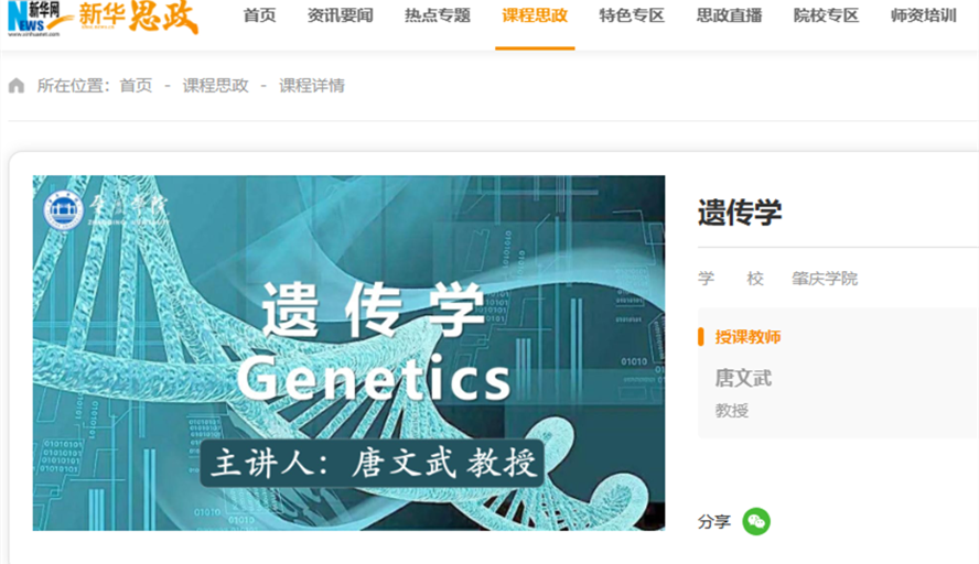 本网讯 6月7日,生命科学学院唐文武教授主讲的《遗传学》课程思政案例,在新华网“新华思政”平台上线,向全社会开放共享,形成良好的示范效应。