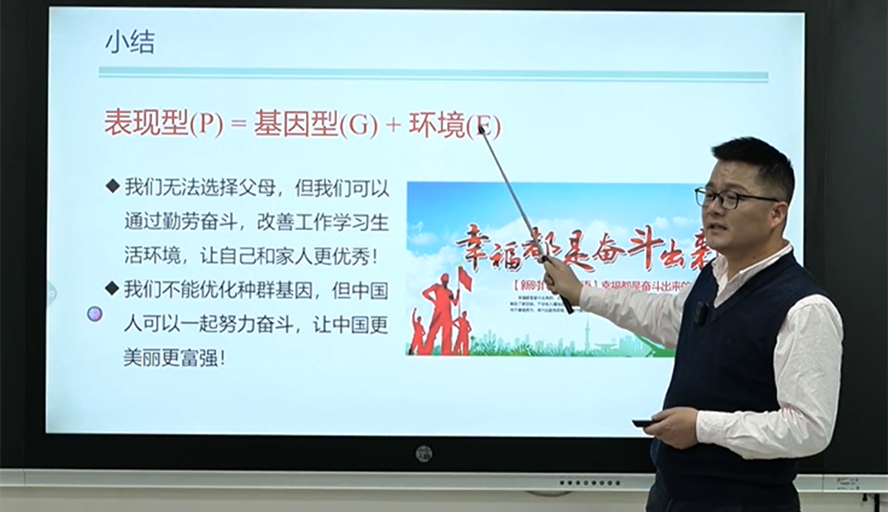 本次新华思政在线教学内容为“孟德尔定律的扩展”,主讲教师在授课的2处教学环节融入思政元素。在课堂后测环节,通过讨论分析“改革开放后,我国青少年身高一代比一代高”的调查数据,引导学生得出改革开放以来,在党和政府的正确领导下,老百姓的生活水平提高、营养和养育环境变好,从而使中国青少年一代比一代更优秀,潜移默化地塑造爱党爱国的家国情怀。在课堂小结环节,通过总结遗传学模型P=G+E的本质内涵,传递个人努力奋斗能改善小家的工作生活环境,中国人齐心协力共奋斗能让国家更富强,从而在遗传学角度理解“幸福都是奋斗出来的”价值观。