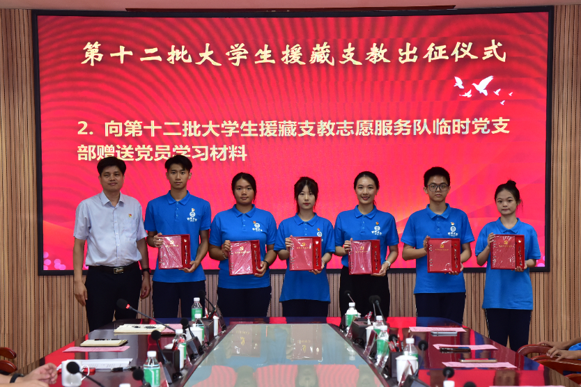 欧洪湛向第十二批大学生援藏支教志愿服务队临时党支部赠送党员学习材料