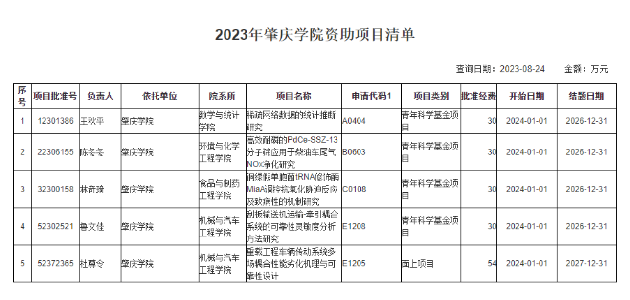 本网讯 国家自然科学基金委近日公布2023年度国家自然科学基金项目立项资助情况,我校5个项目获批资助,其中面上项目1项,青年项目4项,直接经费共174万元,立项数较去年增加3项。