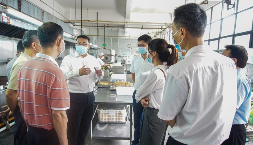 本网讯 9月22日,在副校长唐冬冬的陪同下,肇庆市政府副秘书长伦海亮深入第四食堂,督导检查我校食堂食品安全“两个责任”的落实情况。肇庆市端州区市场监督管理局负责人及后勤管理处负责人参加。