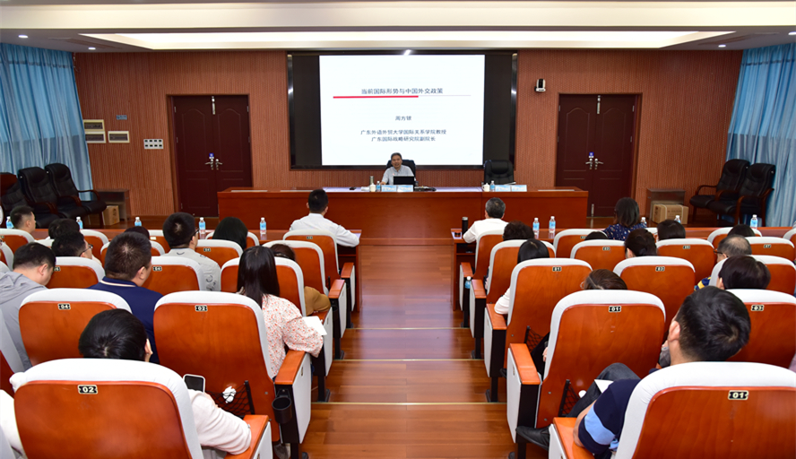 本网讯 10月9日 ,国家社科基金重大项目首席专家、广东国际战略研究院副院长、广东外语外贸大学国际关系学院博士生导师周方银教授应邀到我校作“当前国际形势与中国外交策略及关于政策报告写作的认识与体会”为主题的学术报告。