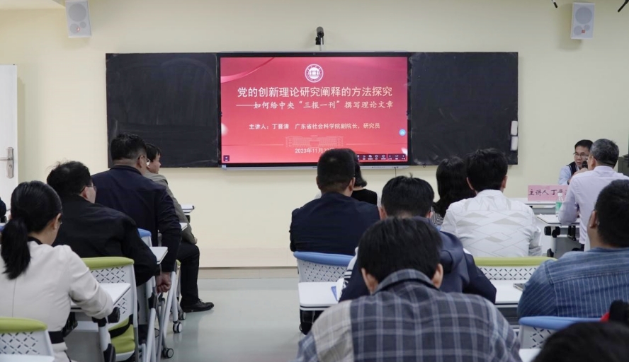 本网讯 为引导广大师生深入学习宣传习近平新时代中国特色社会主义思想,提升师生研究阐释党的创新理论能力和水平,11月22日,我校特邀广东省社会科学院党组成员、副院长丁晋清到校开展专题辅导,主题为“党的创新理论研究阐释的方法探究——如何给中央‘三报一刊’撰写理论文章”。