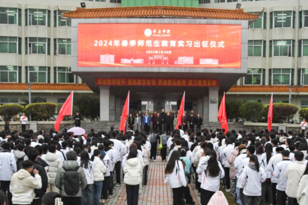 本网讯 2月28日,2024年春季师范生教育实习出征仪式在国砚广场举行。校长吴业春出席,副校长肖起清主持,相关职能单位负责人和各二级学院院长、分管实习工作的副院长、实习基地校长代表、教育实习指导教师和学生代表参加。