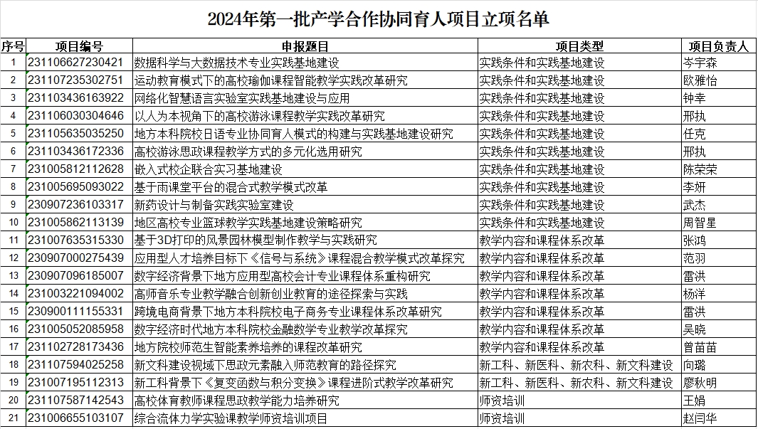 本网讯 近日,教育部高等教育司公布2024年第一批产学合作协同育人项目立项名单,我校21个项目喜获立项,其中实践条件和实践基地建设10项,教学内容和课程体系改革7项,新工科、新医科、新农科、新文科建设2项,师资培训2项,立项数量实现新突破。