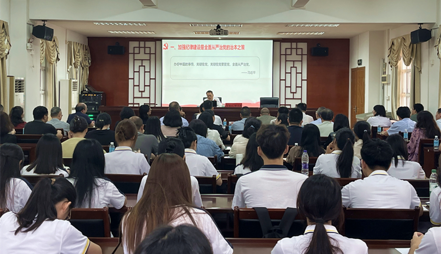 胡文涛以《全面加强党的纪律建设》为题,围绕“加强纪律建设是全面从严治党的治本之策、严明政治纪律和政治规矩、加强经常性纪律教育、严格各项纪律执行”四个方面,全面回溯了新民主主义革命时期、社会主义革命和社会主义建设时期、改革开放时期党的纪律建设的百余年发展历程;并以详实数据和丰富案例,从理论维度、历史维度、现实维度强调了开展党纪学习教育的重要性和必要性。同时,他紧密联系实际,深刻剖析违纪违法典型案例,教育引导党员师生自觉用党规党纪校正思想和行动,增强政治定力、纪律定力、道德定力、抵腐定力。