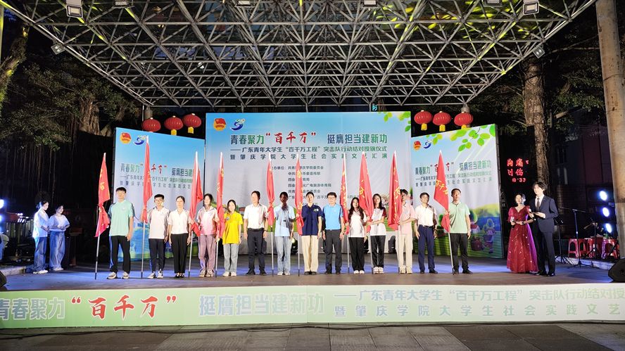 活动现场,参会领导嘉宾为10支在四会市结对开展实践活动的广东青年大学生“百千万工程”突击队行动授旗。