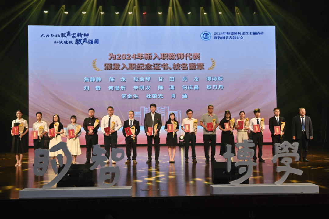 颁奖环节,校领导分别为荣获“执教30年”的教师代表颁发证书,为“教学质量十佳教师”“实践教学优秀指导老师”“教书育人、管理育人、服务育人”“科学技术奖”“社科优秀成果奖”等相关教师颁奖,为新老师代表颁发入职纪念证书、校名徽章。
