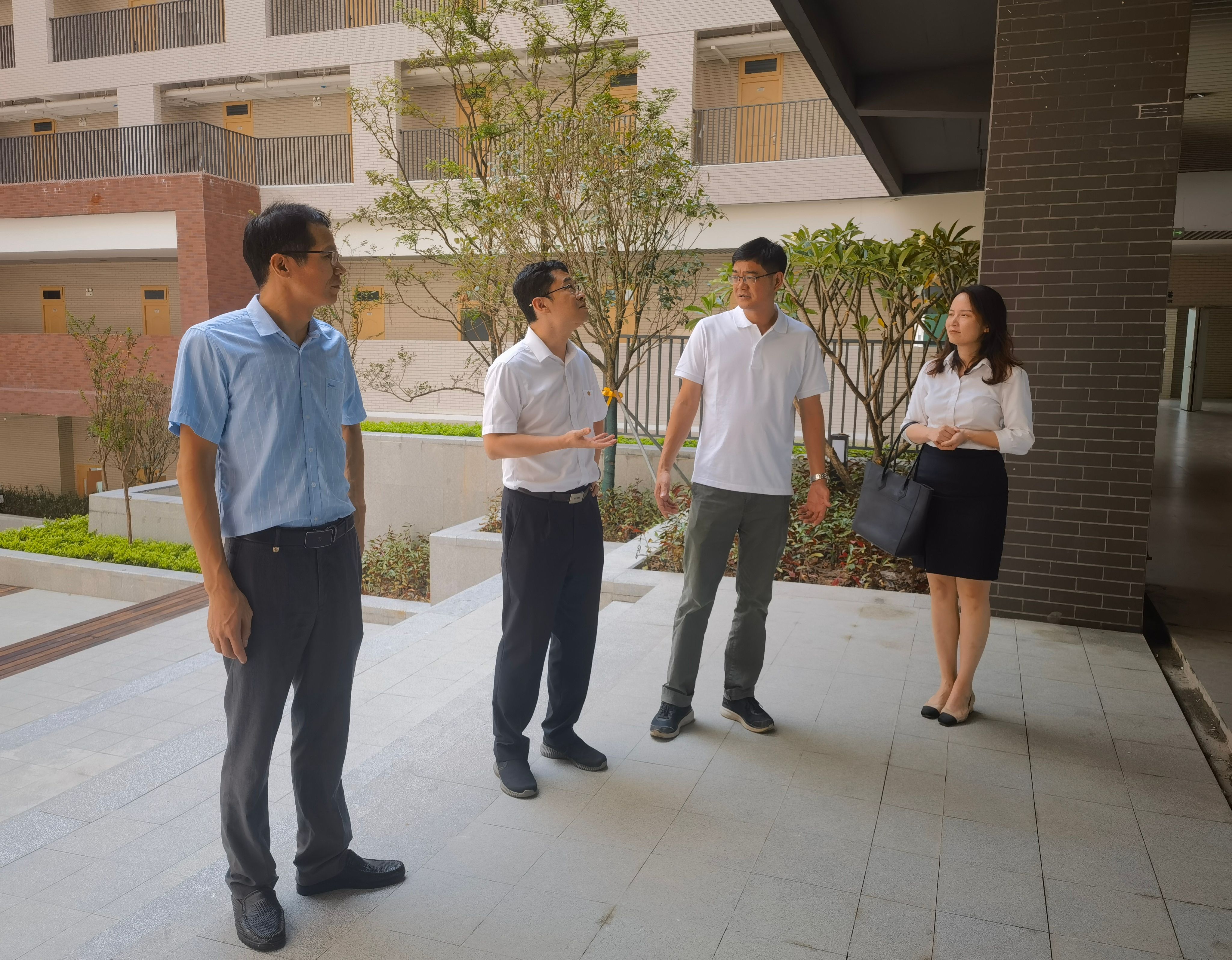 期间,蔡俊彬一行在唐冬冬的陪同下参观了新校区,并就学生入住新宿舍、新宿舍使用智能卡、新教学楼建设及周边用地建设情况进行了实地调研。