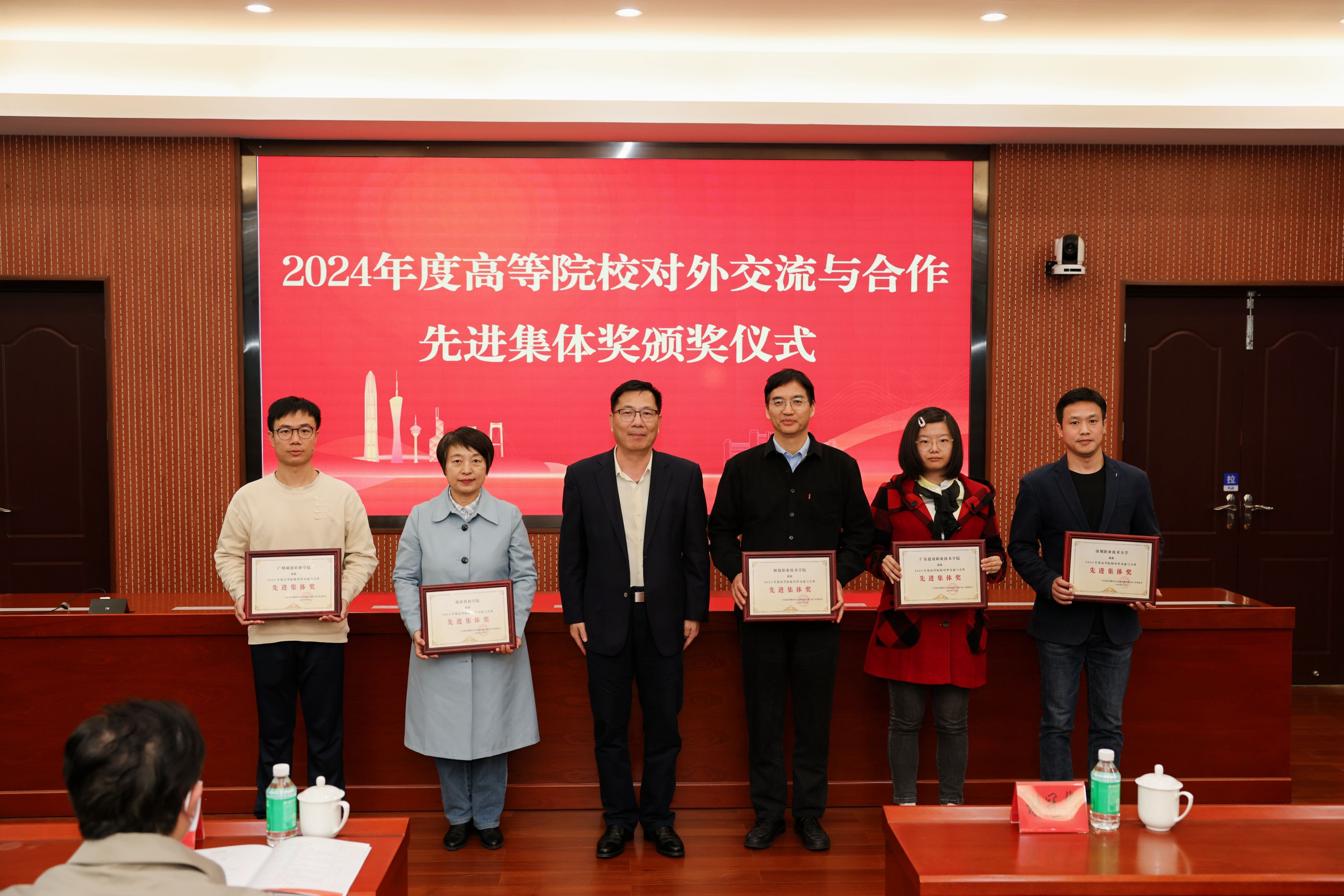 随后,中山大学国际交流合作处副处长余伯俊宣读了2024年度高等院校对外交流与合作先进集体奖、优秀个人奖、外国专家国际合作奖的获奖名单。谢冠华和李金俊分别为获得先进集体奖的院校代表颁奖,以表彰他们在对外交流与合作工作中所做出的突出贡献,激励全省高校进一步加大对外交流与合作力度,提升教育国际化水平。