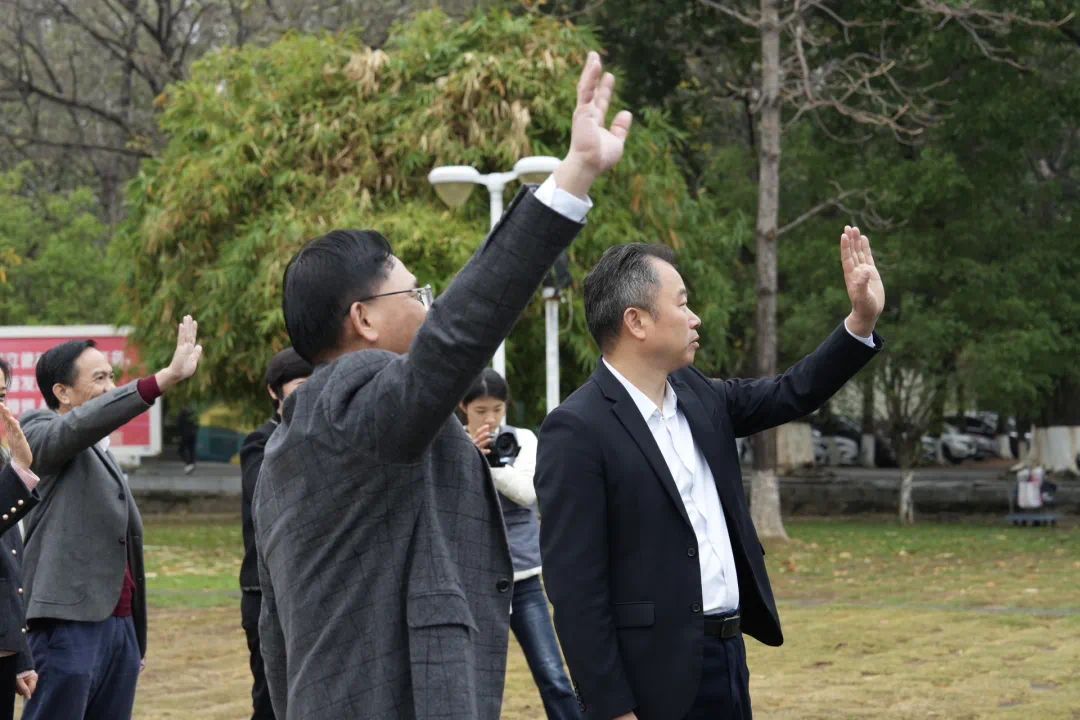 随后谢冠华为实习队伍授旗,队员们领旗挥旗,以赤诚之心立下圆满完成教育实习任务的誓言,用蓬勃朝气彰显勤学笃行的青春芳华。鲜明的旗帜迎风飘扬,象征着教育使命的代代传承。