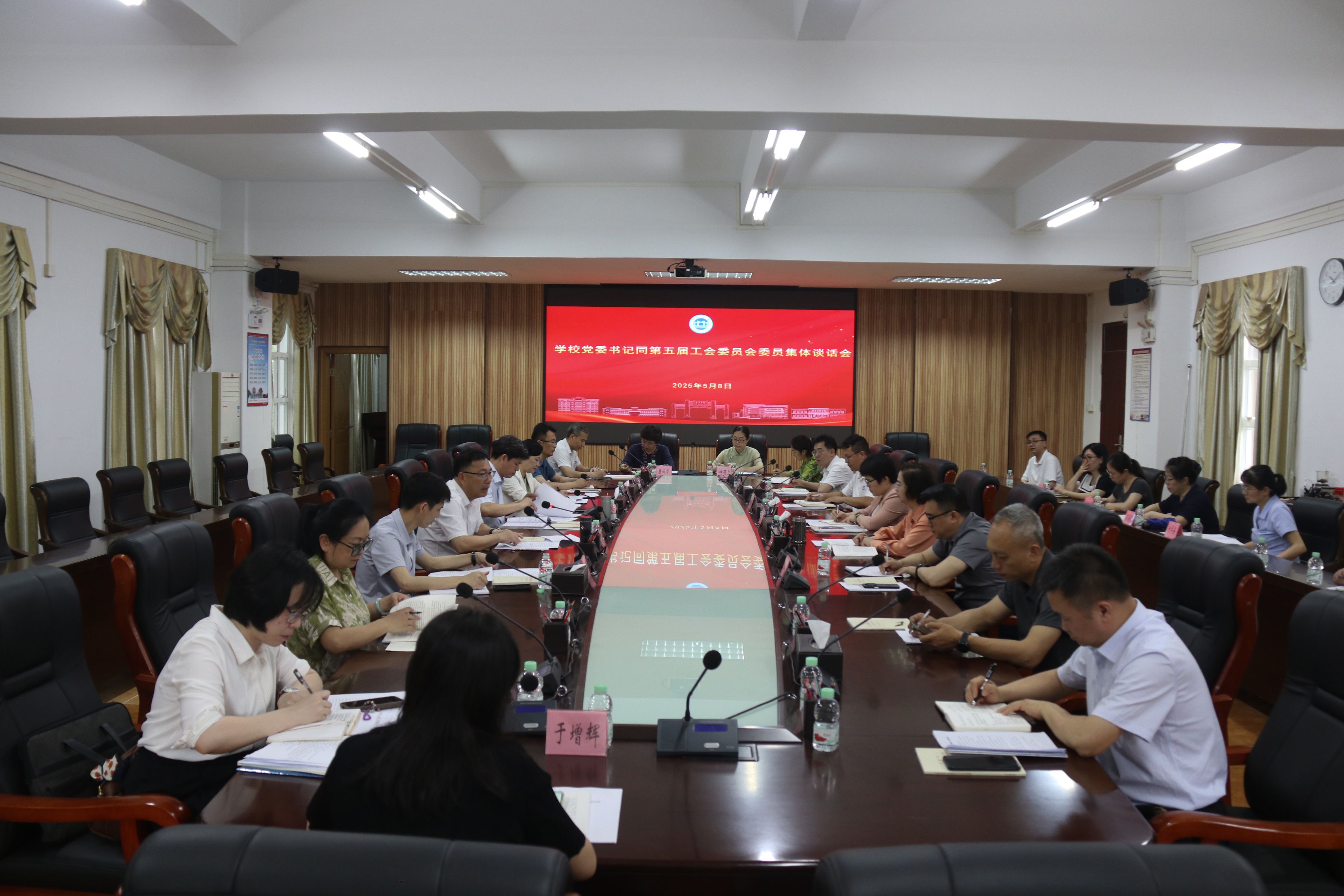 本网讯 5月8日,学校党委书记谢冠华同第五届工会委员会委员集体谈话。组织部负责人、第五届工会委员会、经费审查委员会、女教职工委员会委员参加会议。会议由校党委副书记、工会主席欧洪湛主持。