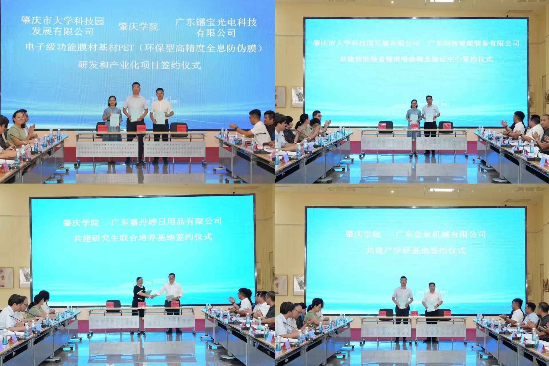 在前期校企深入对接的基础上,本次活动现场校方与企业签订了4项协议:一是与广东镭宝光电科技有限公司签订电子级功能膜材基材PET(环保型高精度全息防伪膜)的研发和产业化项目,实现填补国内技术空白;二是与广东创智智能装备有限公司签订全国首个涂装行业新技术概念验证中心项目;三是与广东嘉丹婷日用品有限公司签订共建研究生联合培养基地项目;四是与广东金宗机械有限公司就机械设计、专业人才培养等签订产学研合作基地项目。