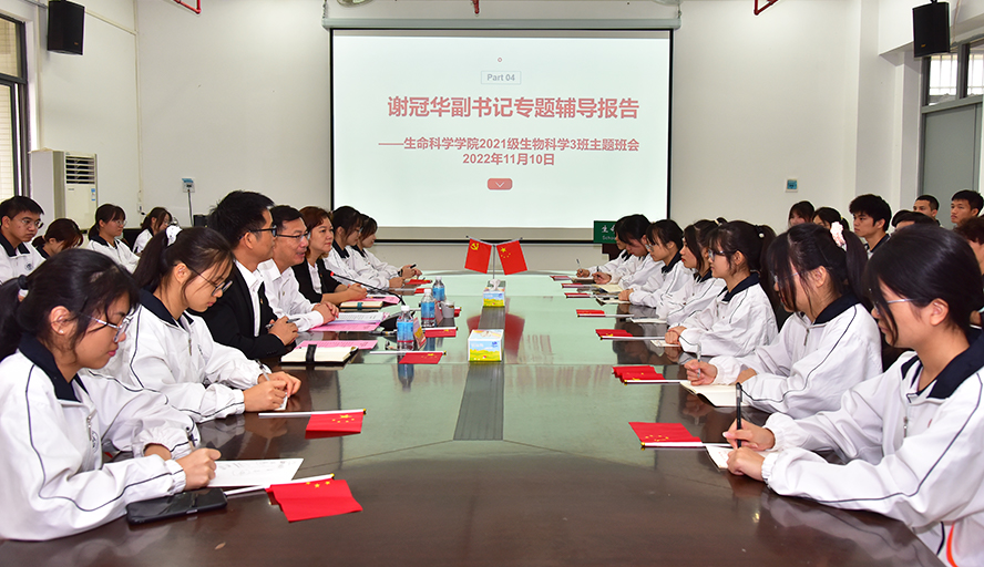 本网讯 校党委副书记谢冠华近日参加生命科学学院2021级生物科学3班“学习党的二十大精神 争做新时代好青年”主题班会并作专题辅导报告。生科院党委书记胡隼陪同。
