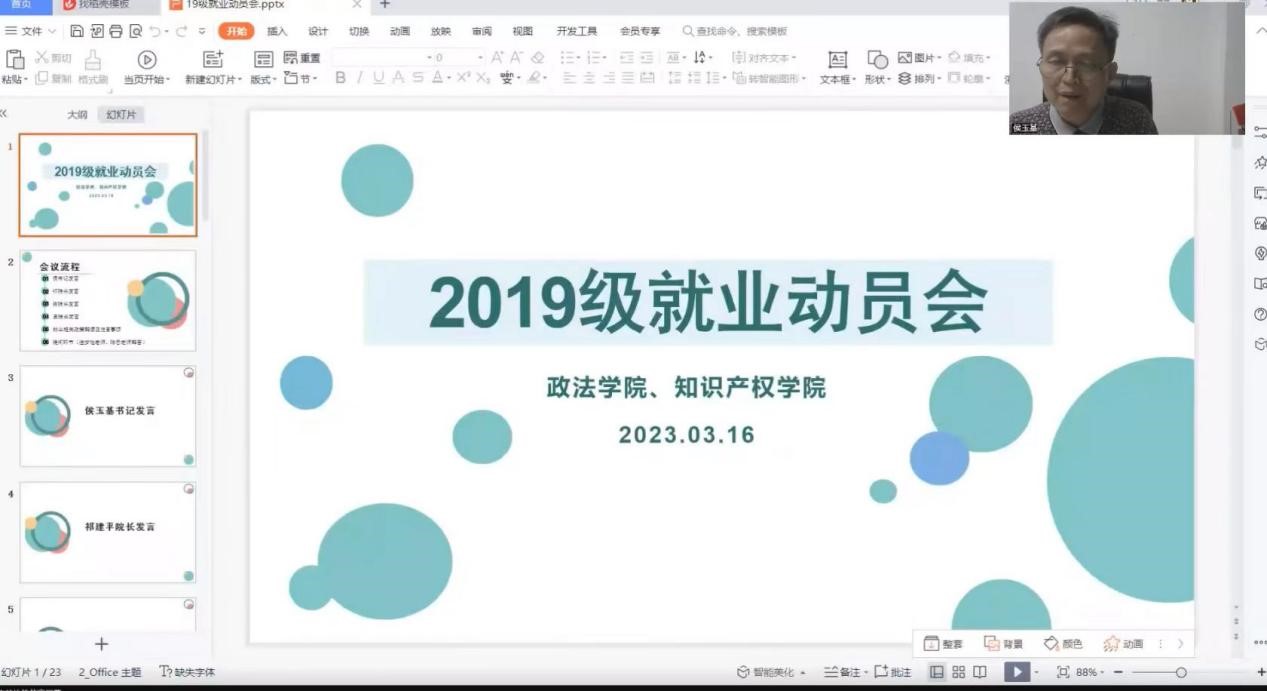 本网讯 3月16日,政法学院、知识产权学院召开2023年毕业生就业动员会视频会议。学院党委书记侯玉基,院长祁建平,副院长佘发勤、易明出席并讲话。负责就业的辅导员、班主任和全体2023年毕业生参加。