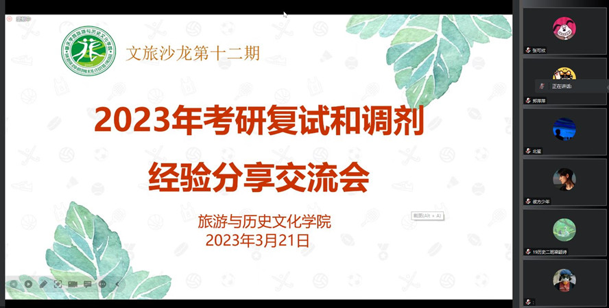 本网讯 3月22日,旅游学院线上举行2023年考研复试与调剂经验分享交流会,加强考研学生复试与调剂的分类指导,帮助其明确方向、了解资讯、掌握技巧,提高2023届毕业生考研录取率。院长李朝军、院党委书记杨雪梅出席。