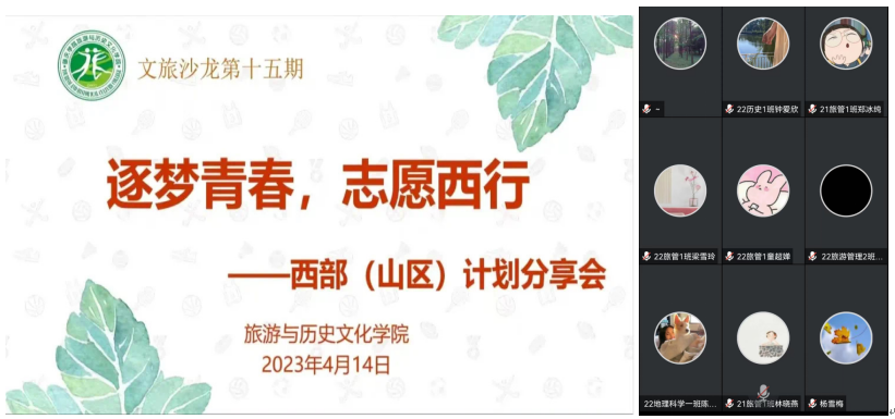 本网讯 为厚植家国情怀,激发青年使命担当,积极践行志愿服务精神,旅游学院文旅沙龙第15期于4月14日召开大学生志愿服务“西部计划”和“山区计划”经验分享会。活动邀请陈静仪、陈韩诗、林卓彦三位校友线上分享她们的志愿服务经历。学院党委书记杨雪梅参加。