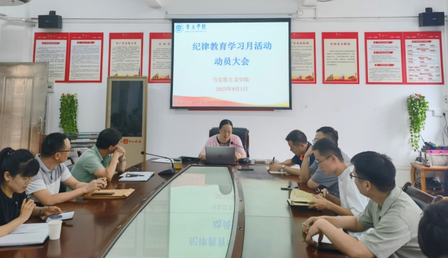本网讯 9月1日,马克思主义学院召开纪律教育学习月活动动员大会。会议由学院党总支书记、院长曹顺霞主持,全体教职员工出席。会议分析了近几年高校系统违法乱纪案件的危害性,强调要筑牢信仰之基,绷紧纪律之弦,时刻保持政治上的清醒。