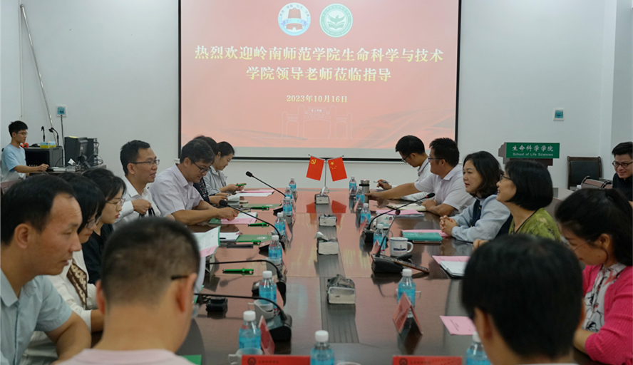 本网讯 10月16日,生命科学学院迎来岭南师范学院生命科学与技术学院院长刘锴栋、副院长孙余丹一行,双方就基层党建、审核评估、科技创新、招生就业等方面工作进行了交流。院党委书记胡隼、主持行政工作副院长邵玲出席活动。