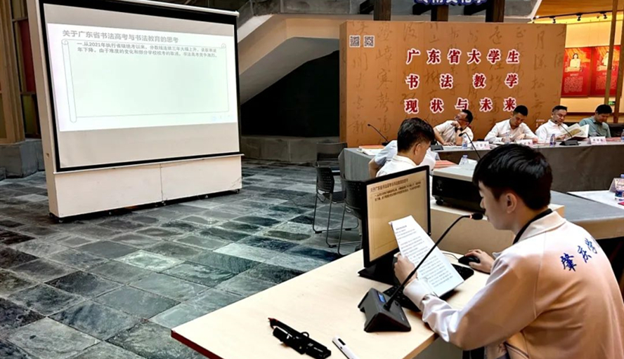 在“广东省大学生书法教学现状与未来”交流会上,2020 级书法专业学生李永乐围绕大学生书法教学现状与未来作了个人探讨式分享,让各高校更加了解我校的书法专业建设成果。