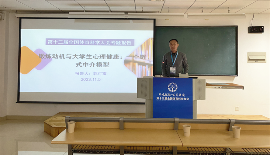 本届大会采用“主会场+分会场”模式进行,体育学院教师提交的论文分别作专题报告、墙报交流及书面交流。其中,郭可雷教授作《锻炼动机与大学生心理健康:一个链式中介模型》《大学生锻炼坚持性与自杀意念:链式中介模型检验》专题报告,王娟、郭思强、李辰、童瑶和陈贵成分别作学术论文墙报交流,殷瑞作学术论文书面交流。
