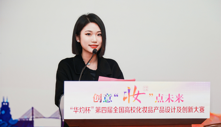 陈嘉欣同学代表参赛学生发言,她表示作为当代化妆品专业青年需要发扬“钉钉子精神”,在设计开发化妆品的过程中保持稳扎稳打、锲而不舍的精神状态,坚定不移的打造更安全、更可靠、更有效的产品。