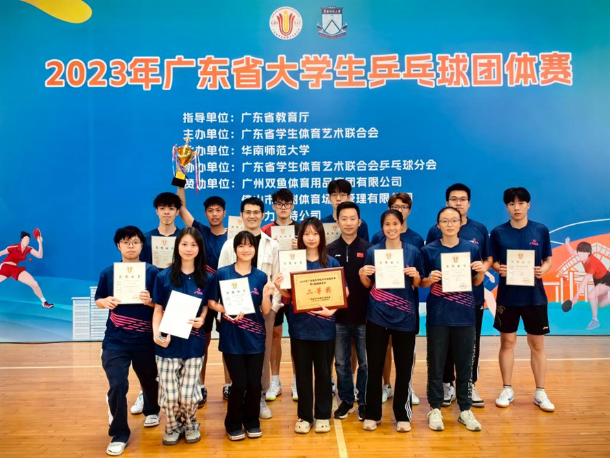 本网讯 11月24日至28日,由广东省教育厅指导、广东省学生体育艺术联合会主办的2023年广东省大学生乒乓球团体赛在华南师范大学如期举行。万象城娱乐awc线路乒乓球队共派出8名男运动员、6名女运动员分别参加甲、乙组别比赛。在体育与健康学院副院长杨丽华、教练杨博的带领下,每名球员都顽强拼搏,尽力发挥出最好水平。