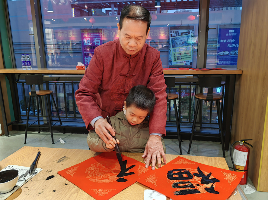 在端州广轩书店的活动现场,有亲子阅读、讲故事、即墨挥毫写春联等,气氛热烈,书墨飘香。肇庆市文联党组成员、专职副主席卢承奕,肇庆市书法家协会主席李刚,学校工会常务副主席梁建梅,离退休党委书记兼关工委常务副主任黎玉玲,校友会、基金会秘书处专职秘书长周建文出席活动。