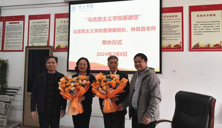 本网讯 3月8日,马克思主义学院在三教317会议室举行教师荣休仪式,向荣休的曹顺霞教授、钟其昌副教授送上敬意与祝福。学院党政领导班子及教师参会,荣休仪式由学院党委书记侯玉基主持。