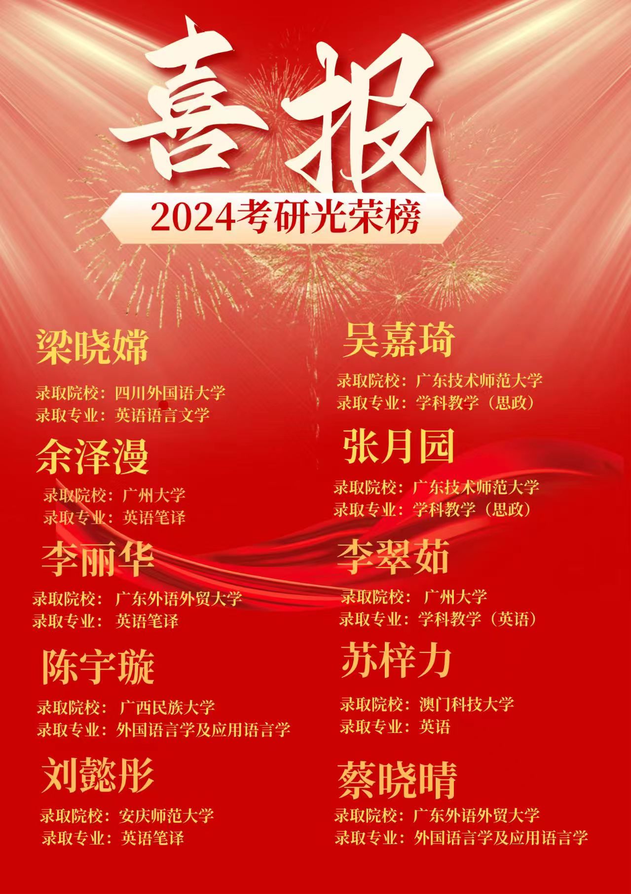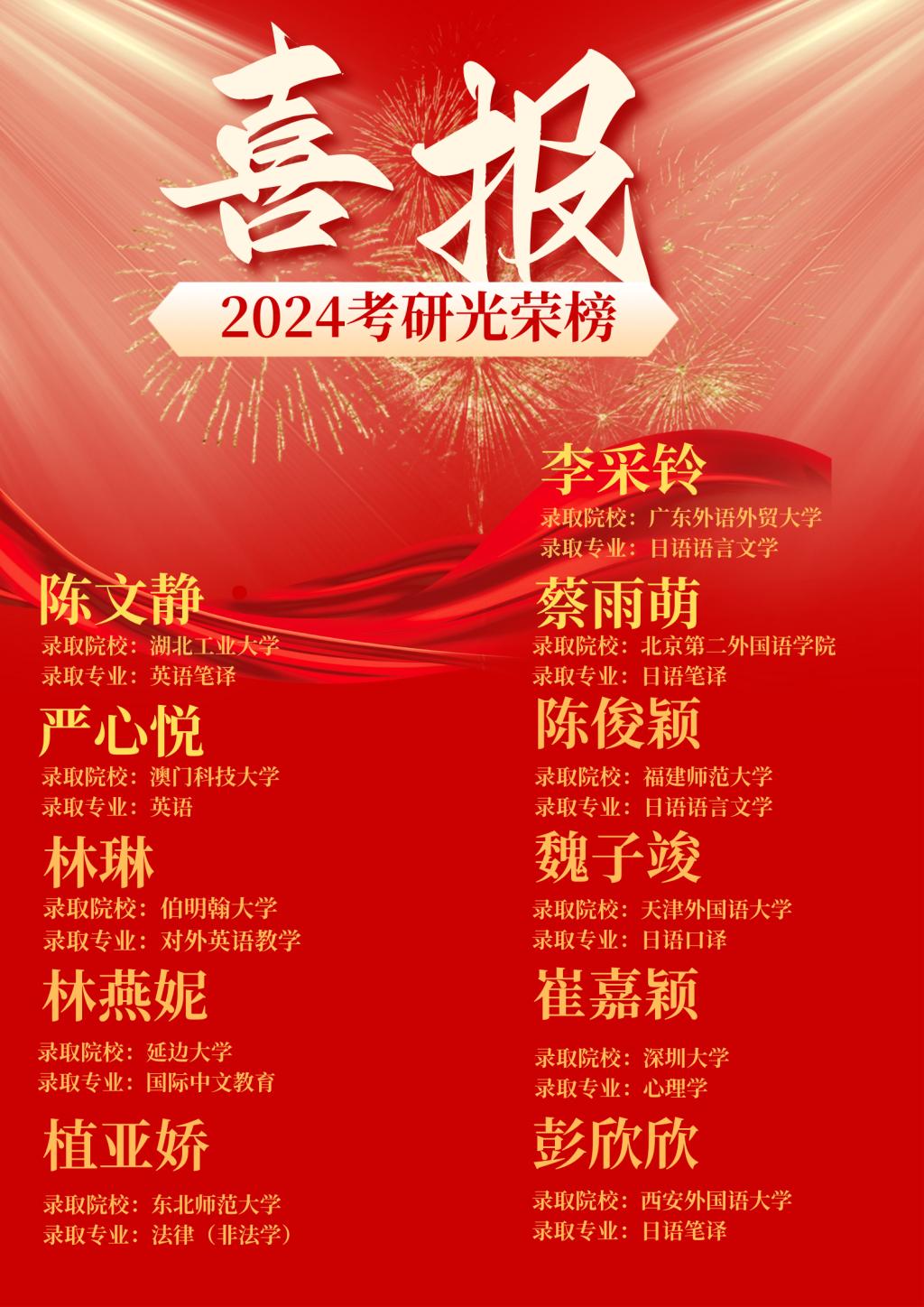 本网讯 研途漫漫终酬梦,硕果累累映日辉!近日,2024年全国硕士研究生招生录取结果陆续公布,截止至5月10日,外国语言文化学院2024年考研再传佳绩。外国语言文化学院2024届本科毕业生270人,考研人数54人,录取21人,录取人数创历史新高。