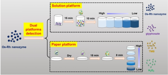 农药残留对人类健康的潜在影响日益受到关注,而草甘膦作为一种广泛使用的除草剂,其残留检测尤为重要。传统的基于纳米酶的农药比色检测方法通常依赖于天然酶的辅助,这使得检测过程和结果易受天然酶稳定性和活性的影响。为克服这一局限,在本工作中,我们成功制备了一种具有优异过氧化物酶模拟活性的Os-Rh纳米酶,并基于其构建了两种比色平台,用于直接检测草甘膦。研究结果显示,草甘膦能够通过阻碍Os-Rh纳米酶分解H2O2产生HO∙的过程,进而灵敏且选择性地抑制纳米酶的过氧化物酶样活性。基于此原理,双比色平台在宽浓度范围内(溶液平台为50~1000 μg/L,纸平台为200-1000 μg/L)实现了对草甘膦的高灵敏度检测,检测限分别为28.37 μg/L(溶液平台)和400 μg/L(裸眼检测限)/123.25 μg/L(灰度检测限)(纸平台)。此外,该平台在实际应用中也表现出良好的可靠性和准确性,成功应用于实际样品的检测,回收率在92.78~102.75%之间,相对标准偏差(RSD)为1.17%-3.88%。总的来说,本研究开发的基于Os-Rh纳米酶的草甘膦直接比色检测平台不仅具有显著的实际应用潜力,而且为基于纳米酶的农药快速比色检测传感方法的合理设计和开发提供了新的启示和思路。这一创新方法有望推动农药残留检测技术的进步,为食品安全提供更强有力的保障。