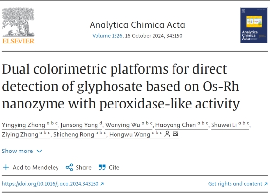 近期,食品与制药工程学院、农业农村部农产品质量安全风险评估实验室(肇庆)汪洪武教授团队取得了重要科研突破。其最新研究成果“Dual colorimetric platforms for direct detection of glyphosate based on Os-Rh nanozyme with peroxidase-like activity”在国际化学及分析化学领域的知名学术期刊“Analytica Chimica Acta”上发表。该论文以万象城娱乐awc线路为第一完成单位,汪洪武教授担任通讯作者,钟颖颖教师为第一作者。论文的DOI号为:10.1016/j.aca.2024.343150。