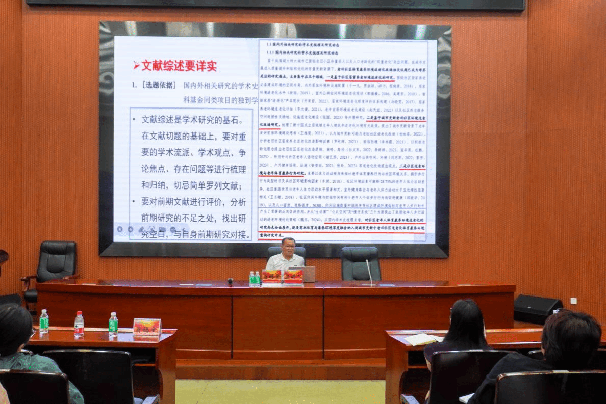 翁锡全首先对2024年国家社会科学基金项目立项结果进行了简要分析,并对课题选题、申报书填写等关键内容进行辅导。翁教授还与在场的师生进行了互动交流,回答了大家关心的问题。他鼓励在场的师生积极申报科研课题,不断提高自己的科研能力和水平。