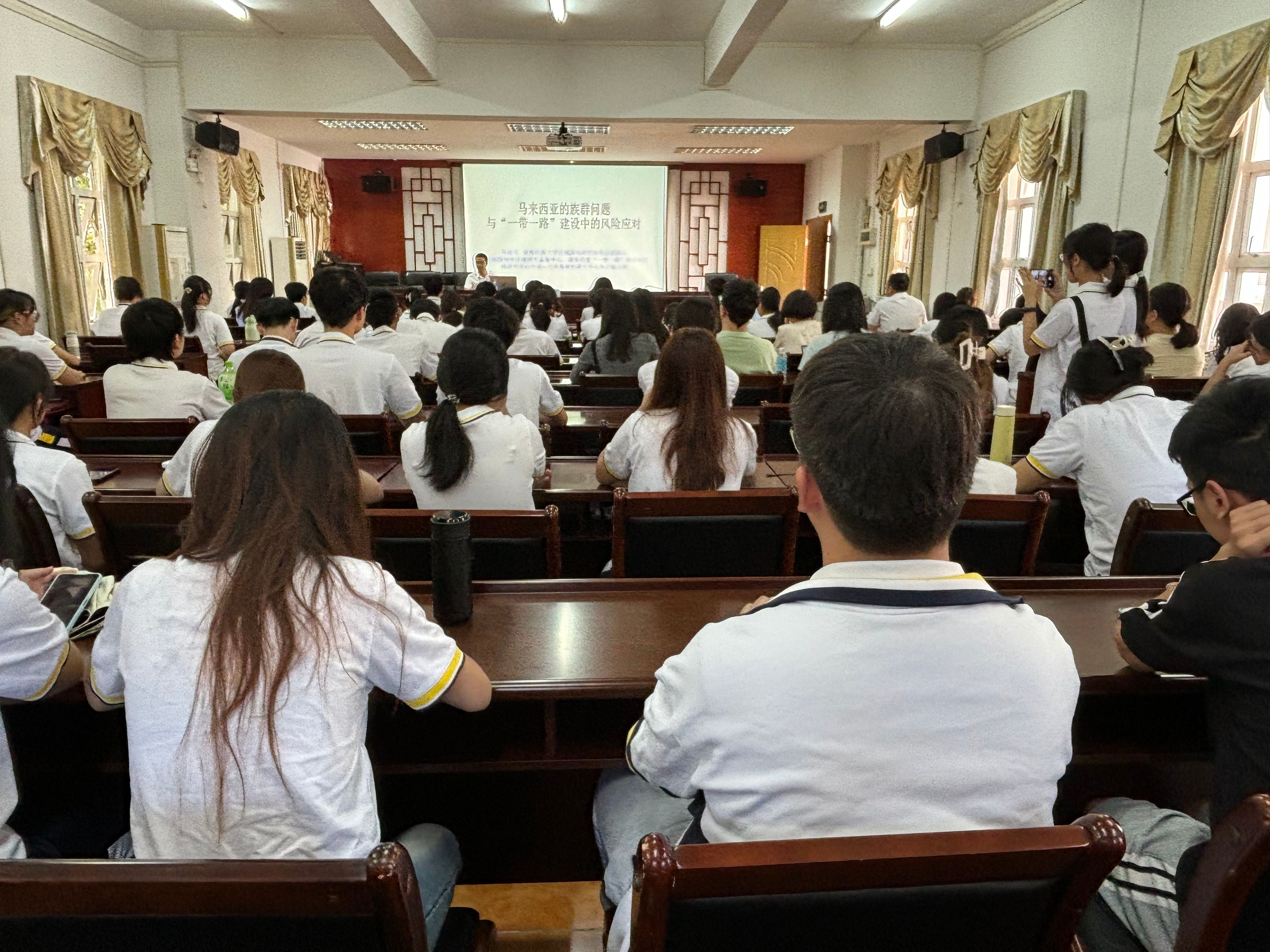 马海龙教授的讲座涵盖了马来西亚社会经济发展、族群团结对国家复兴的重要性等方面的内容。他深入分析了中马政治与经济合作的现状与前景。马教授结合学科特点,特别指出外语学科人才在区域国别研究中的独特优势。他鼓励师生通过翻译手段解读海外的第一手资料,并且强调了外语学科在文化互通中的关键作用。通过准确、深入的翻译工作,外语学科不仅能够将海外文化引入国内,更可以为我国在相关区域的决策提供支撑,为“一带一路”倡议的实施贡献力量。讲座结束后,马教授与师生们进行了广泛而深入的交流。