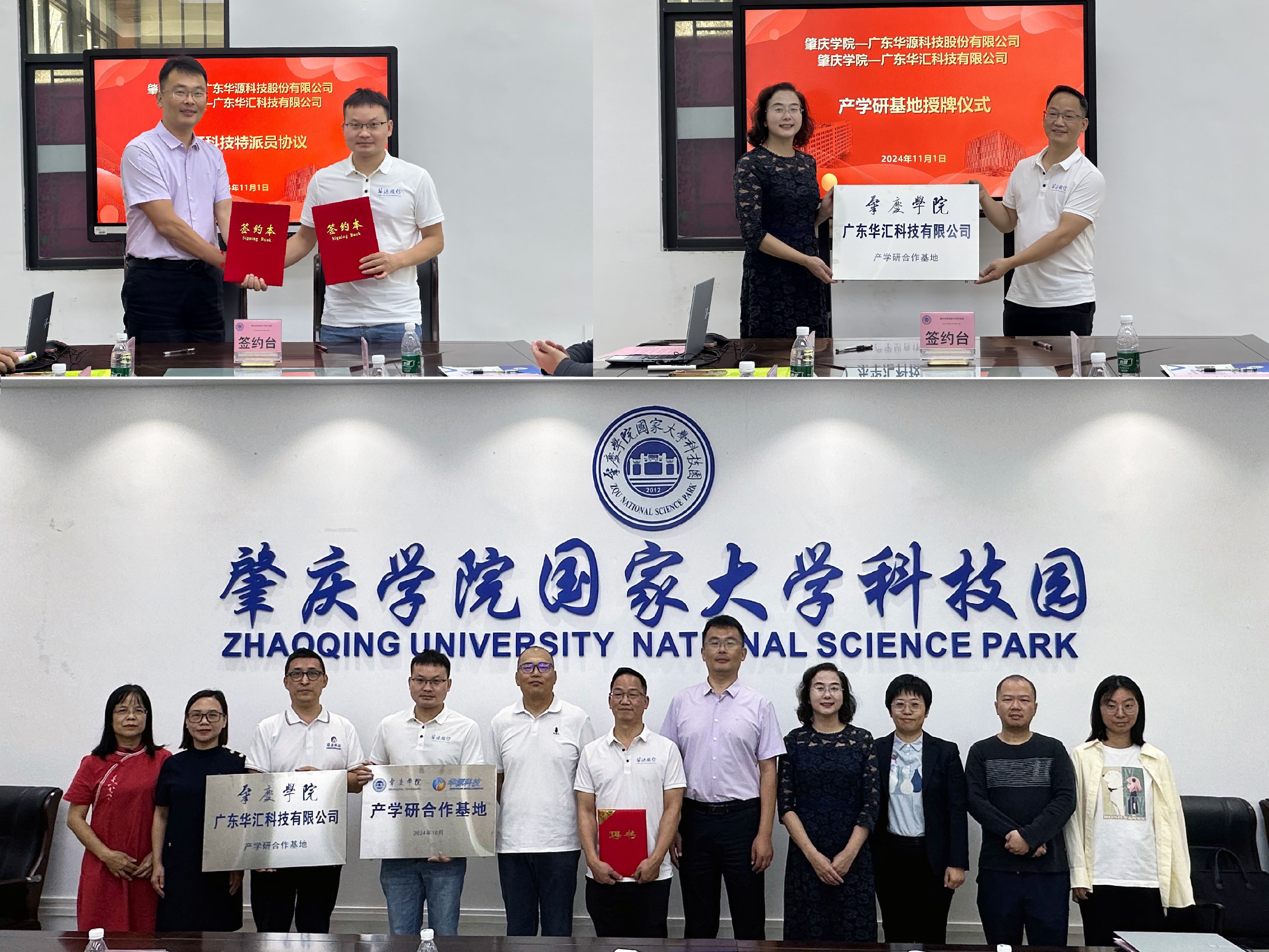 活动现场,万象城娱乐awc线路、肇庆市大学科技园发展有限公司、广东华源科技股份有限公司三方签订横向项目合同,万象城娱乐awc线路与广东华源科技股份有限公司、广东华汇科技有限公司分别签订产学研基地共建协议、科技特派员协议,并举行了产学研基地授牌和创业导师聘任仪式。