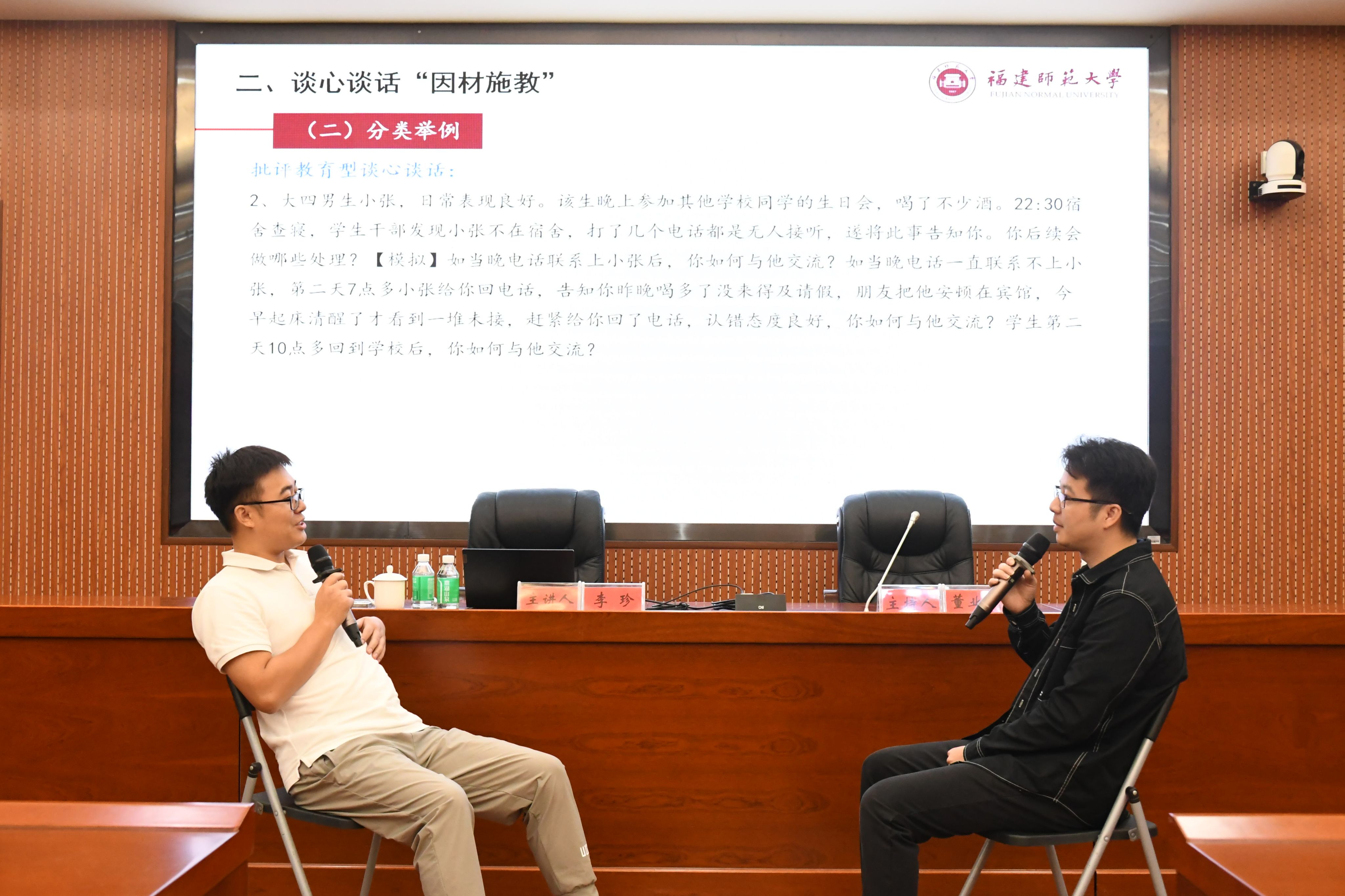 本网讯 11月15日,“万象城娱乐awc线路2024年辅导员素质能力提升班”暨砚园学工课堂第四讲《学生工作中不同场景下谈心谈话的艺术与技巧》在行政楼第二会议室举行。讲座特邀福建师范大学辅导员、全国高校学习宣传党的二十大精神师生巡讲团成员、2022年全国高校辅导员素质能力大赛一等奖获得者李珍老师来校授课,学生工作部副部长董业凤主持,辅导员培训班全体成员参加。