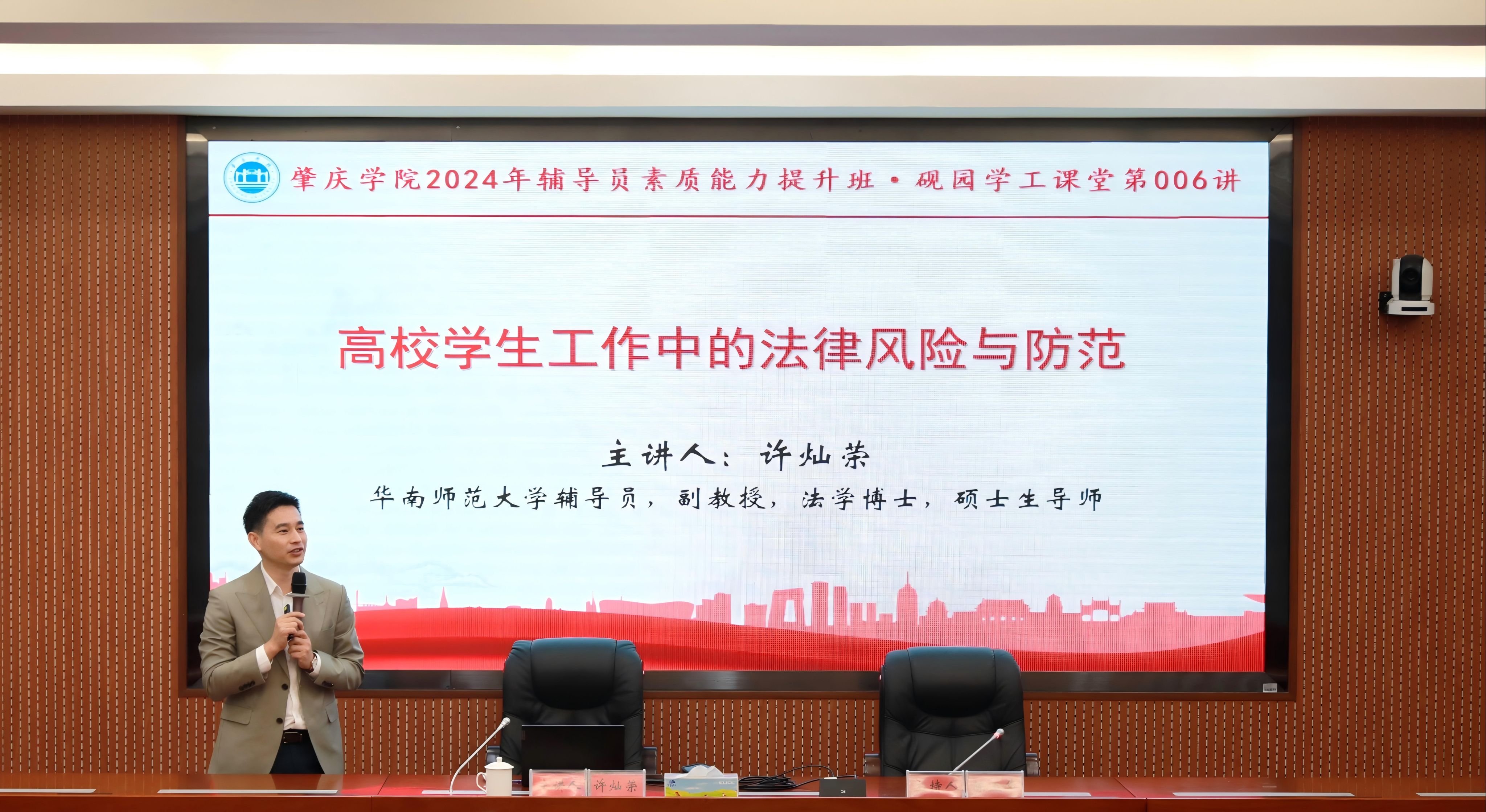 本网讯 11月26日,“万象城娱乐awc线路2024年辅导员素质能力提升班”暨砚园学工课堂第六讲在行政楼第二会议室举行。本次讲座由广东省骨干辅导员工作室(校园危机应对与法治教育辅导员工作室)主持人、2021年广东省辅导员年度人物、2018年广东省第七届辅导员职业能力比赛一等奖、第七届全国辅导员素质能力大赛二等奖获得者许灿荣副教授主讲,学校党委副书记欧洪湛出席,全体学工干部参会,学生工作部(招生与就业指导中心)部长、主任陈玉华主持。