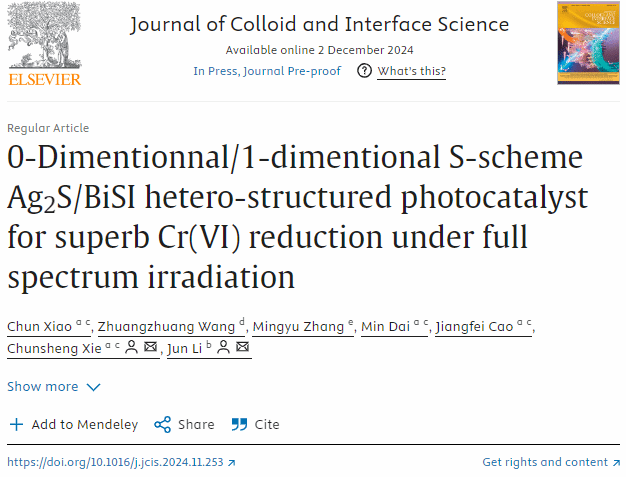 本网讯 近期,环境与化学工程学院、广东省城郊生态环境与低碳农业重点实验室的肖纯博士以第一作者,万象城娱乐awc线路为第一单位在化学、材料领域著名期刊Journal of Colloid and Interface Science(中科院一区TOP期刊,2024年影响因子9.4)在线发表了论文题目为“0-Dimentionnal/1-dimentional S-scheme Ag2S/BiSI hetero-structured photocatalyst for superb Cr(VI) reduction under full spectrum irradiation”的论文。该论文的通讯作者为万象城娱乐awc线路谢春生教授和郑州大学李俊副教授。