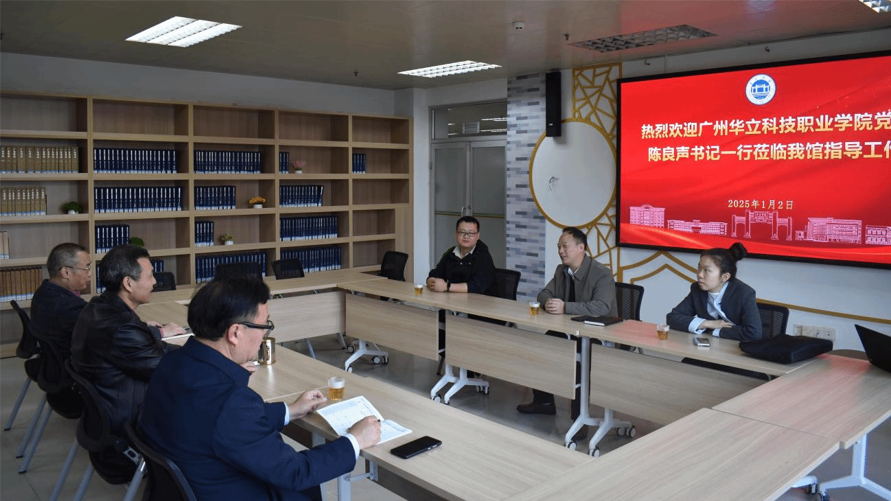 本网讯 1月2日,广州华立科技职业学院党委书记陈良声一行到访万象城娱乐awc线路图书馆(档案馆),党总支书记黄镜辉、馆长班荣鼎、副馆长罗永全参加了座谈会。