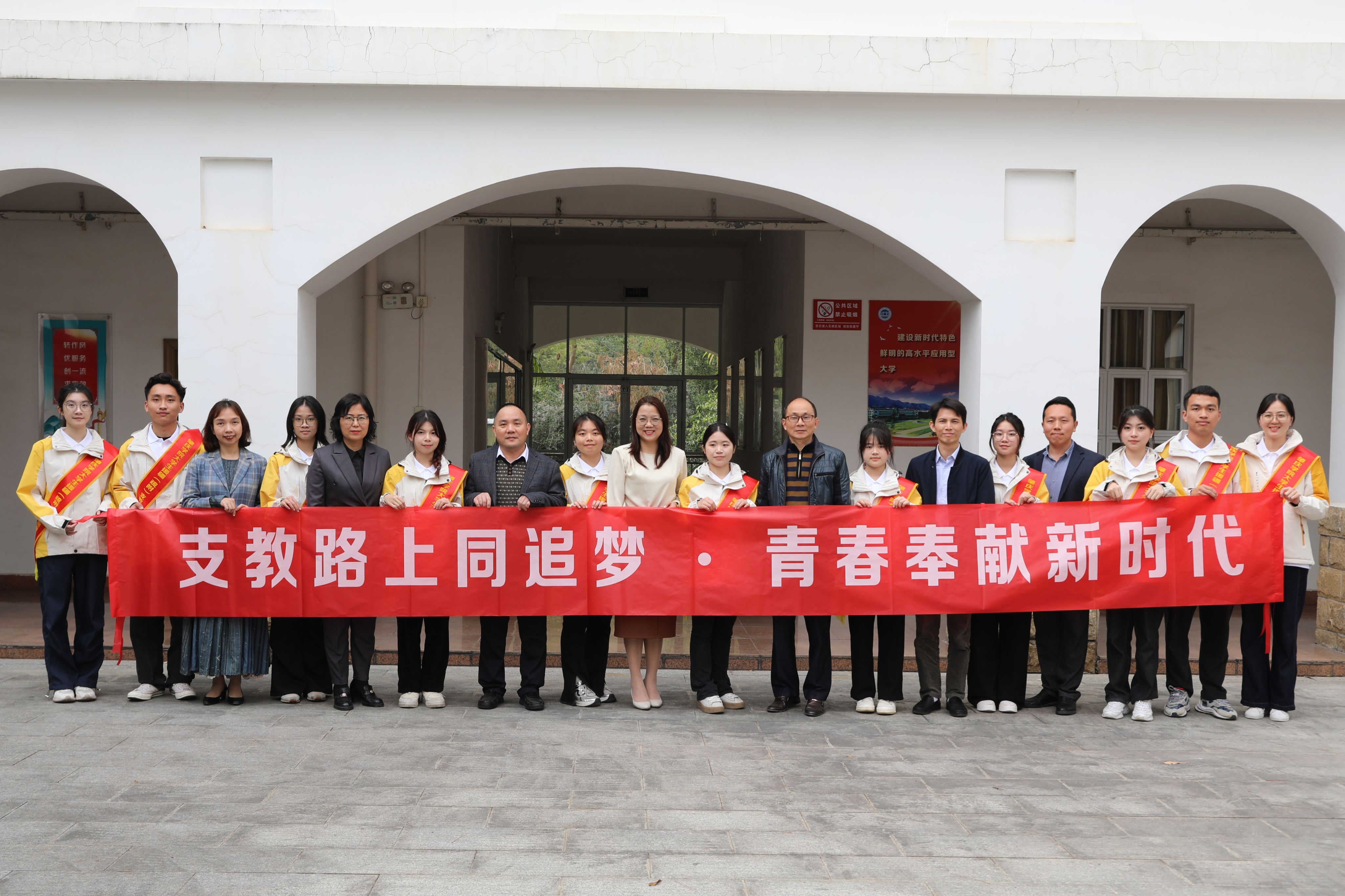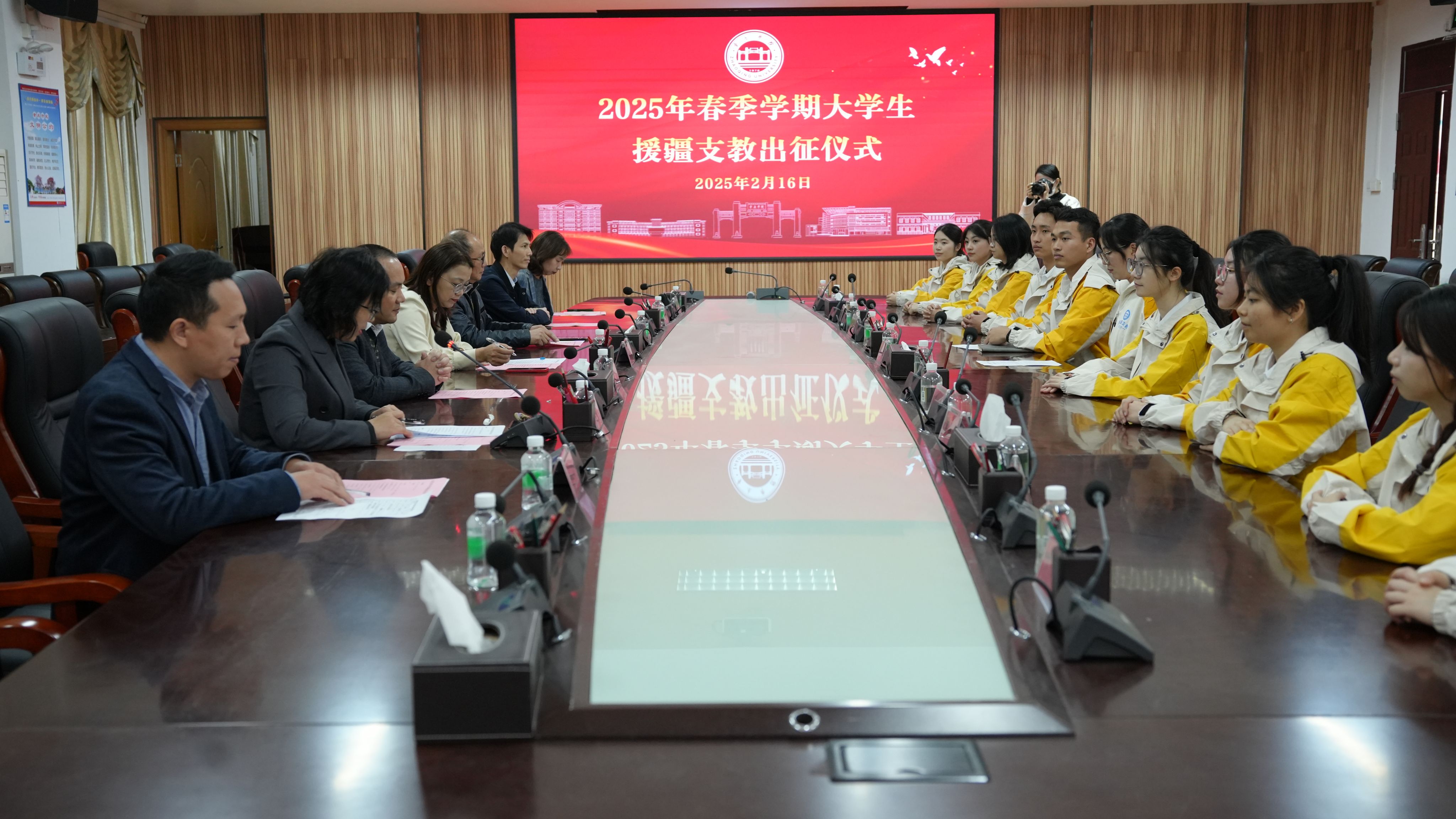 本网讯 2月16日,2025年春季学期援疆支教出征仪式举行。组织部、学工部相关负责人、援疆支教队员所在学院教科院和文传院党委负责人、第六批援疆支教服务队全体成员参与,仪式由学工部副部长董业凤主持。