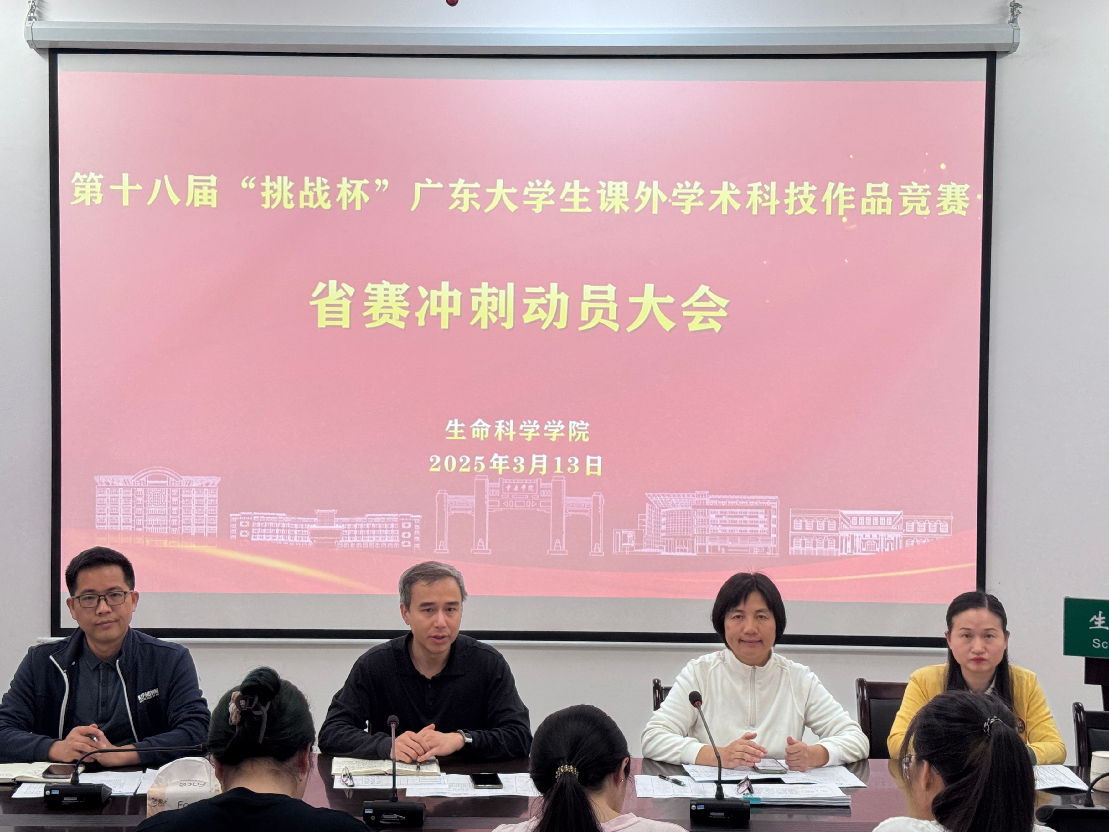 本网讯 3月13日,生命科学学院召开第十八届“挑战杯”广东大学生课外学术科技作品竞赛省赛冲刺动员会。学院党委书记黄剑青、院长邵玲、副书记邱兴和、副院长陈华,5支入围省赛的参赛团队成员及指导教师参会。会议由邱兴和主持。