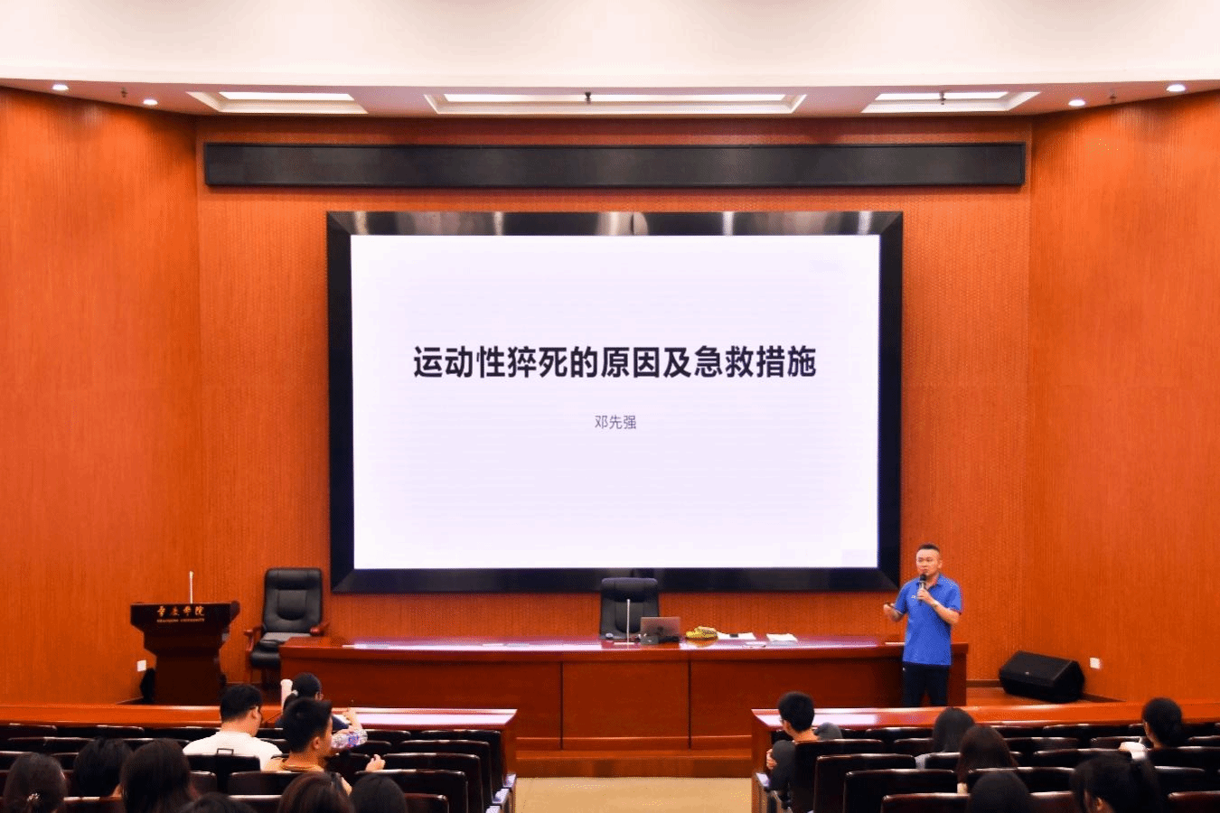 本网讯 4月24日,我校举办主题为《运动性猝死原因及急救措施》讲座,由体育与健康学院副教授邓先强主讲,各二级学院近四百名学生代表参加。