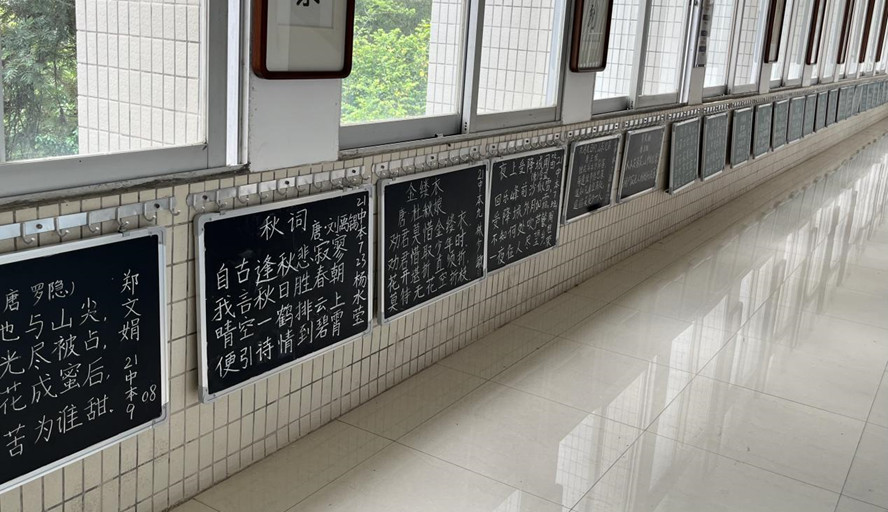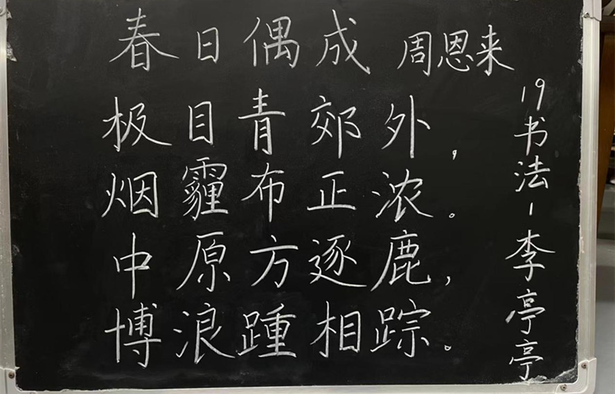 粉笔字内容取材于百篇经典诗词背诵篇目,以及文学院教师精心挑选出的两百余篇中国优秀古诗词。在书写粉笔字的过程中同学们也都收获了自己独特的体会。2021级汉语言文学8班的李依敏同学表示:“在粉笔字书写练习过程中,不仅懂得了‘勤能补拙’,还收获了诗的智趣,我相信只要不断练习总能写好。同时,诗词中那穿越岁月、直击心灵的思绪所带给我的感动和震撼是真真实实的。”