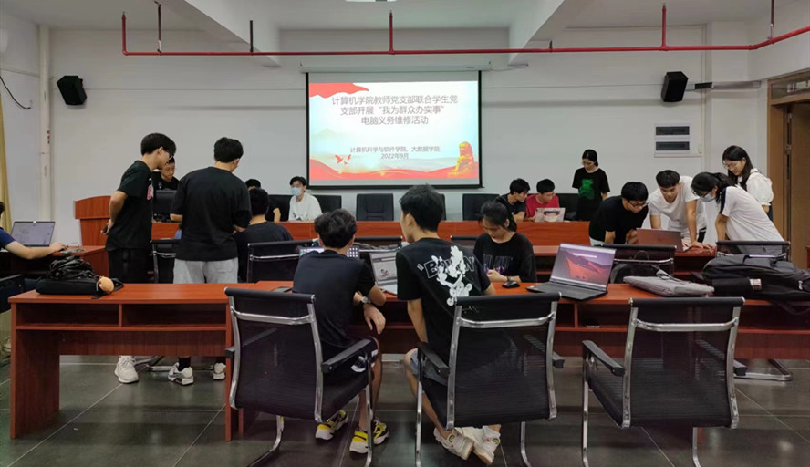 本网讯 近日,计算机学院组织教师党支部、学生党支部连续开展了两场“我为群众办实事——电脑义修”活动,共维修电脑60多台,全校师生对学院师生党员和志愿者的服务精神表示高度赞扬。