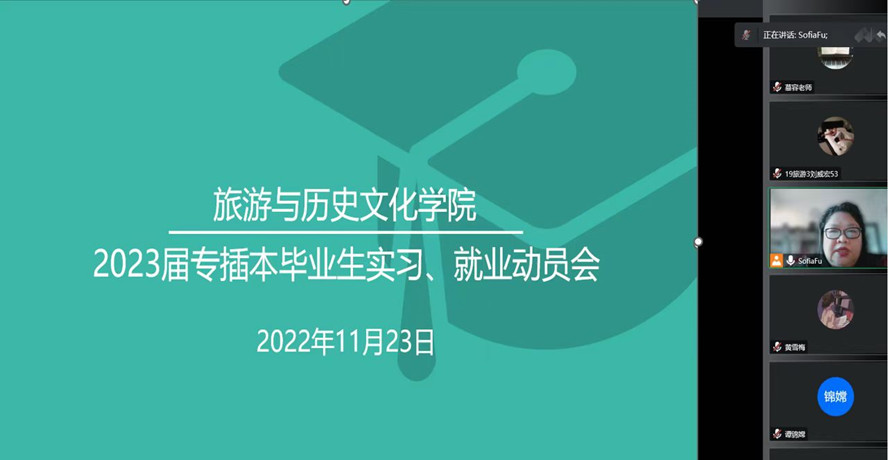 11月23日,旅游学院线上召开2023届专插本180名毕业生实习、就业工作动员会。学院党委陈军副书记传达全国高校毕业生就业创业工作网络视频会议的精神,分析当前就业的严峻形势。希望同学们踊跃参加学校举办的线上招聘会,积极投递简历应聘,做好专业实习和求职就业相结合,尽早落实就业去向,做到先就业、再择业。