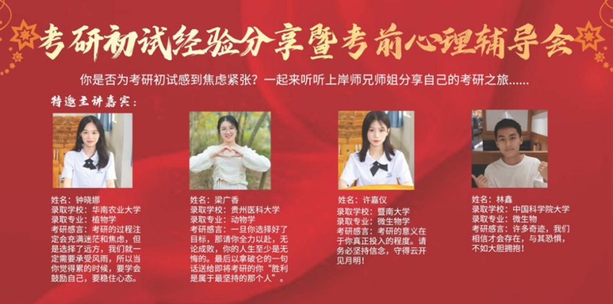 活动伊始,首先播放了往届考研师兄师姐传递来的加油视频,视频中的师兄师姐们为正在备考的师弟师妹们鼓励呐喊,希望他们可以一战成硕,一“研”为定。接着,2022届成功上岸的师兄师姐——华南农业大学的钟晓娜、贵州医科大学的梁广香、暨南大学的许嘉仪以及中国科学院大学的林鑫在线上分享自己的考研经验,传授答题技巧,为师弟师妹们排忧解难。
