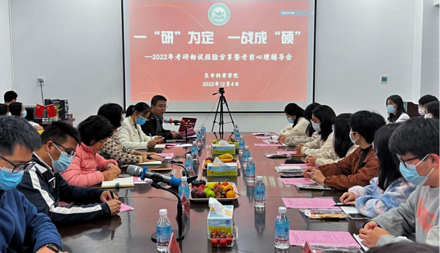 本网讯 近日,为表达对考研学子的关心,生命科学学院举行考研初试经验分享暨考前心理辅导会。党委书记胡隼、主持行政全面工作副院长邵玲出席。